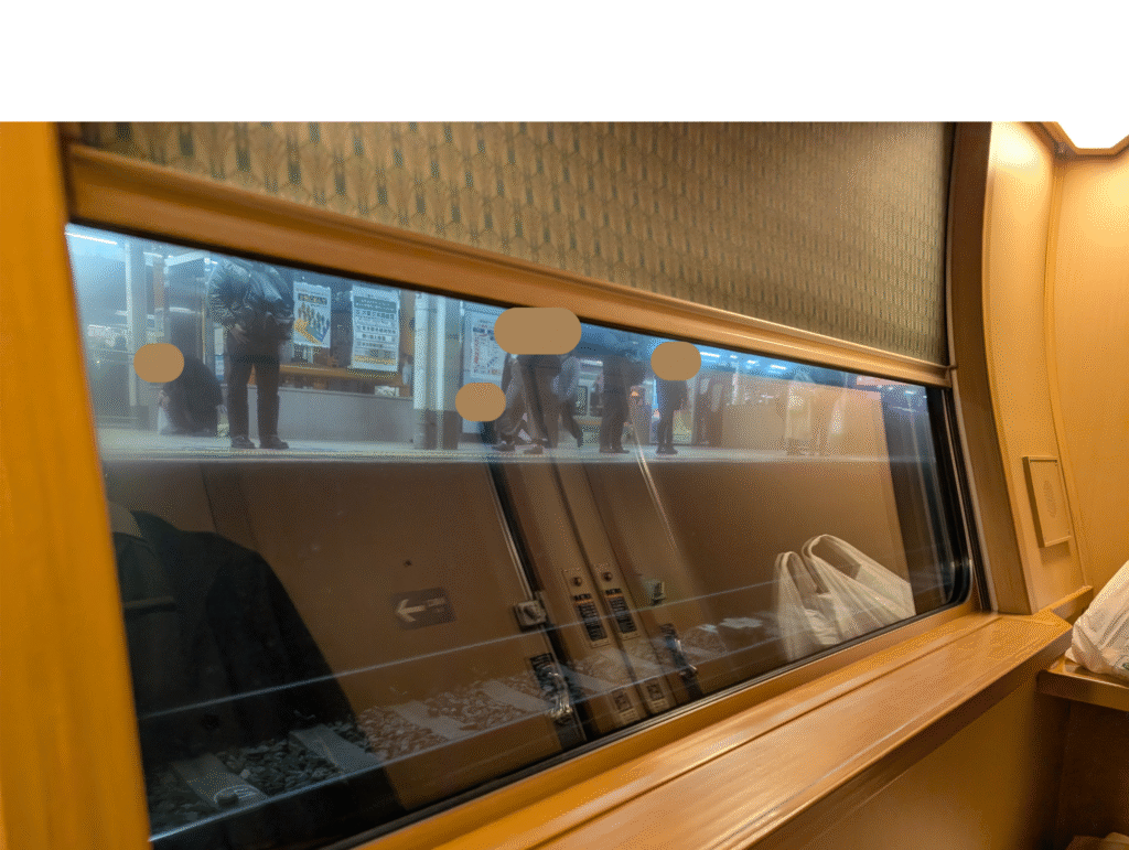 駅で買ったお弁当とお酒をテーブルに広げて部屋に用意してある寝間着に着替えて車窓から駅を眺めます。